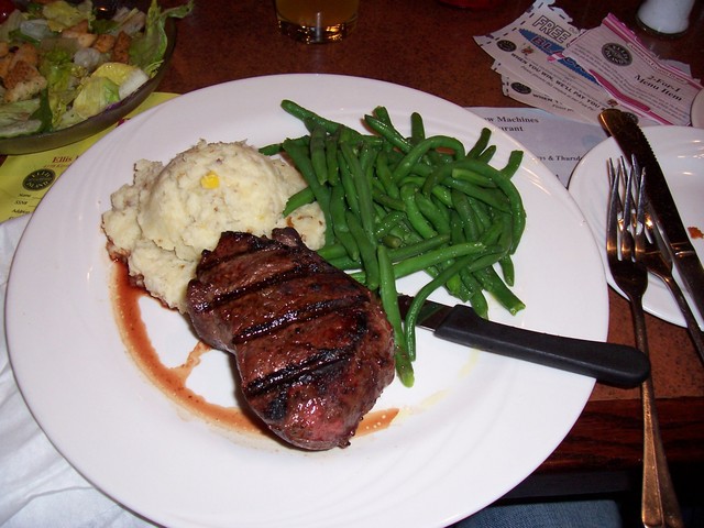 Finally, we sit, and it’s $4.95 steak dinner (always that price at Ellis, no coup needed) time. Steve & I bust out the buy-one-get-one-free coups for some appetizers, and wings & chicken fingers are on the way. If you haven’t had the EI steak dinner, you need to. Food/Service = 8/10.