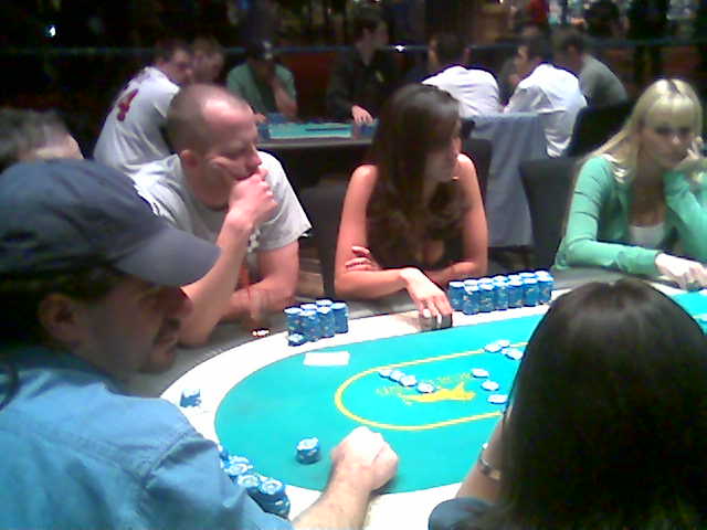 So with those hands and some stupid limping, I’m down like 120 after 30 minutes, then things get a little better. I hit a set & boat and happen to not be involved in pots against Crasian, and end the session down 75. At one point a group of hot girls walks by our table, and one of them waves and says “hi boys”. The whole table turns their heads. One end of the table is whispering and I can’t hear it, then later Dave tells me it was Nicky Hilton. We had the obligatory Johnny Chan sighting too, who walked by Matt & Alex’s NL table.