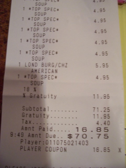 They told us it would be at least an hour wait for a table at the Ellis restaurant, so what better time to make use of some unlimited-drinks-for-2-for-one-hour coupons from the POV? I shared mine with my brother, and Steve shared his with Ubaldo. We gave the other guys a couple of 4-free-cocktails coups and we were good to go. I don’t remember much of that next hour or so except running to bar every 5-10 minutes in between blackjack and craps. We had all these blackjack match-plays but somehow I still dropped 40, and then 20 or 40 at craps, which I’d never played before. Yeah that was smart.