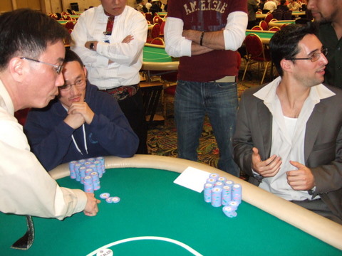 We took a ten minute break and I wandered around the room. We were now going to 400/800/50 ante with 12 tables left at the break. 430 players started the tournament so there were 430,000 chips in play. With about 100 players left, the average stack was ~4000 or barely 5x the BB. I felt like the white guy in the locker room.