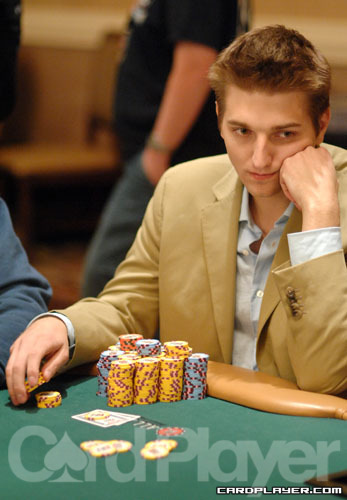 Tony Dunst moved all in for his last 133,000 and Matt Vengrin made the call in the big blind. Dunst showed KK and was up against 98. Dunst held a big lead, but the board came 10 8 7 J 10 to send him to the rail in eighth place. After the hand, Vengrin was up to 1.5 million in chips.