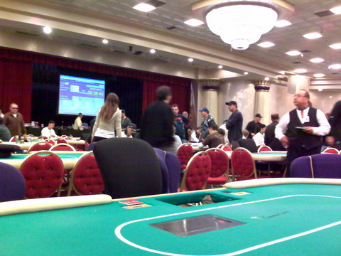 The tournament started in 20 minutes and I headed up to the second floor tournament area to pick up a new player card (required for entry) and sign up. Commerce holds its tournaments in a 2nd floor ballroom that houses the low stakes NL and limit games. For major tournaments, there's a room divider that's easily retracted creating a larger ballroom capable of handling 60+ tables. The room is self-sufficient with a cashier and snack bar which serves alcohol. There are only a few small flat screen TVs scattered about, but during major tournaments, the tournament clock is projected on a large screen easily visible from any seat in the room. You can get a sense of the room below…