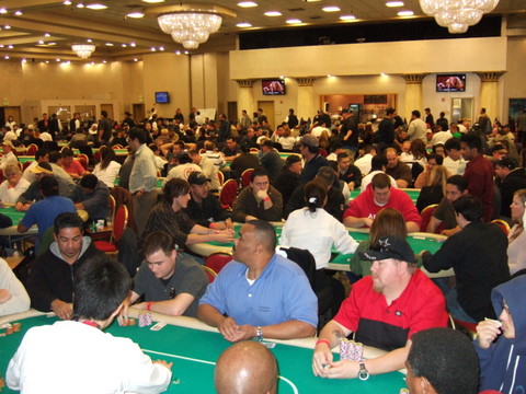 Before the first hand, Conway announced a $50 iTunes gift certificate for the worst-dressed player in the room. There was an immediate commotion as a number of guys started waving, standing on chairs, etc.—trying to call attention to their lack of fashion sense. There were plenty of legitimate contenders but the overwhelming choice was a 27-year-old, 265-pounder from Whittier wearing a tattered ProBass shops shirt that didn’t come close to covering his prodigious gut.